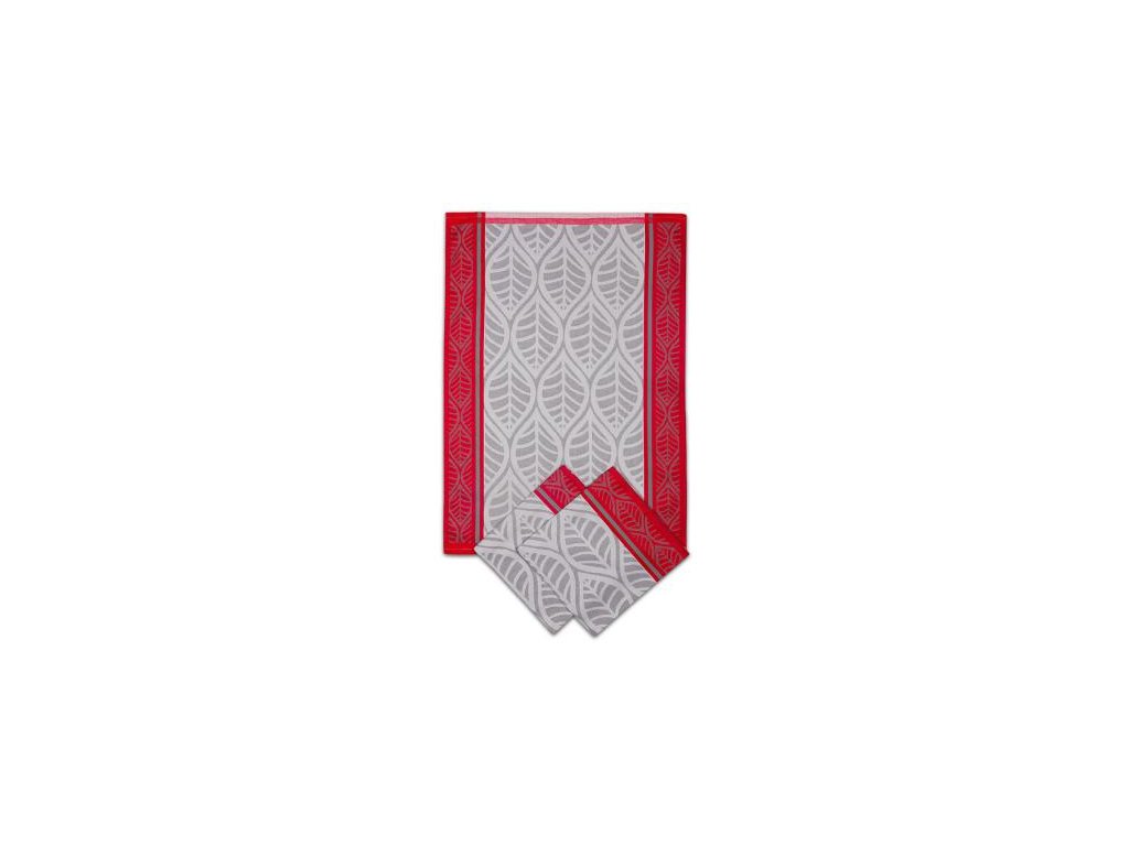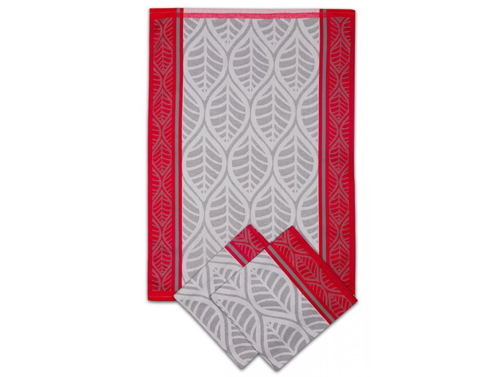 Extra savé žakárové utěrky s motivem listů – červené vnesou eleganci a kvalitu do vaší kuchyně.